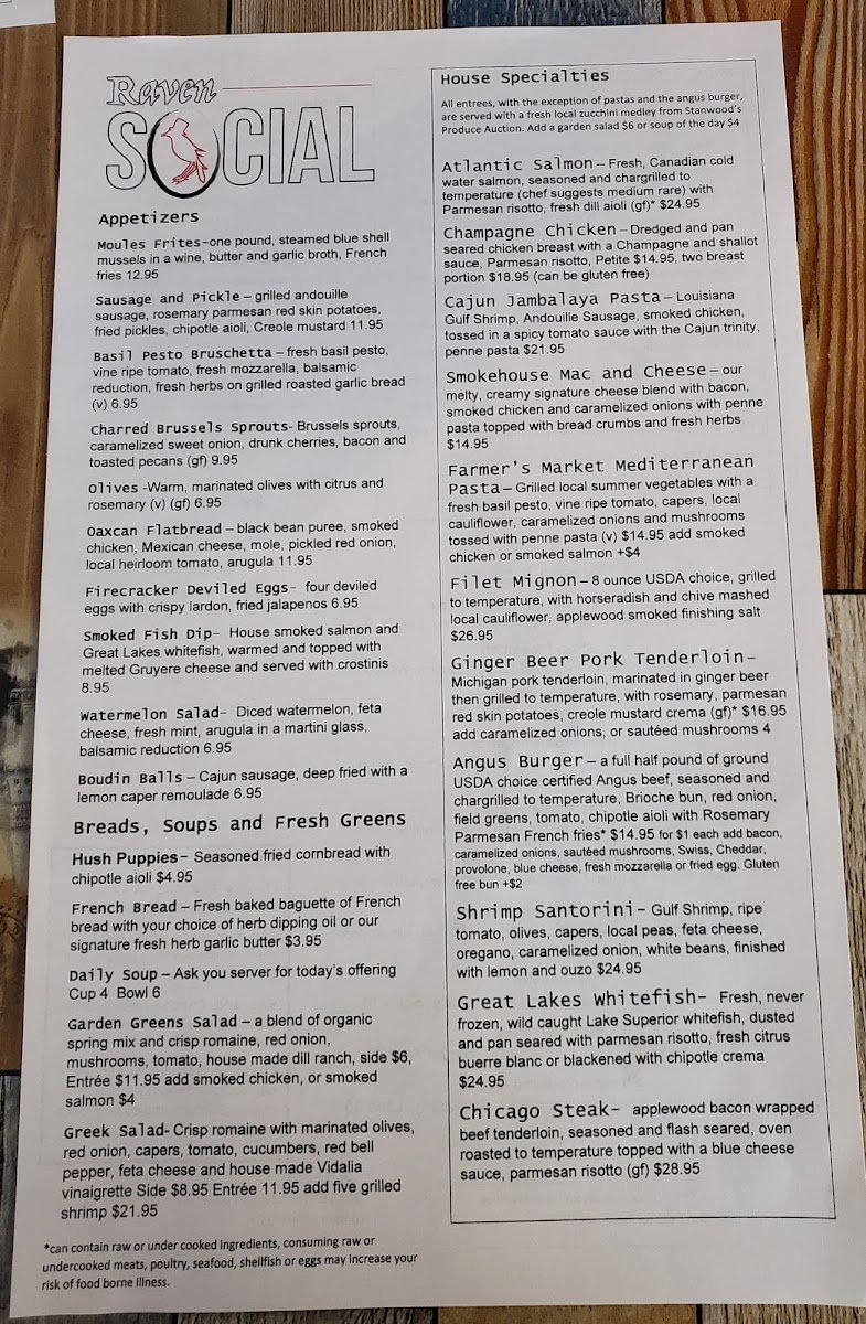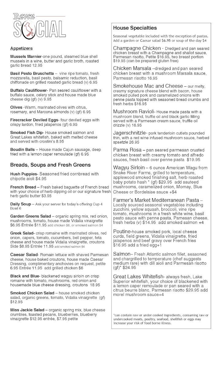 At Raven Social, located in the heart of Cadillac, Michigan, the menu is as inviting as the atmosphere itself. Whether you’re in the mood for a hearty meal or something light and fresh, Raven Social Menu has something to satisfy every craving. The restaurant blends traditional comfort foods with bold, creative flavors, offering dishes that cater to all tastes. From delicious appetizers that spark your appetite to mains that leave you feeling full and content, every bite is crafted with care and quality ingredients. Don’t forget to pair your meal with one of their expertly chosen drinks, adding the perfect finishing touch to your dining experience. Whether you're a local or just passing through, the warm and welcoming vibe at Raven Social makes it the perfect spot for a laid-back meal with great company.